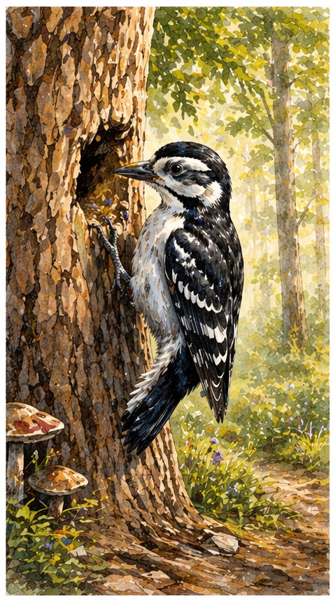 El personaje principal es el Carpintero Blanco y Negro (Leuconotopicus villosus).